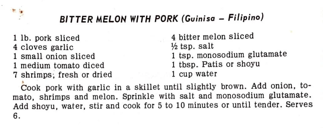 Bitter Melon With Pork (Guinisa - Filipino) Main Dishes Dec 20 Written By Jennifer Hasegawa View fullsize Recipes Home | See All Recipes PorkFilipinoStill More of Our Favorite Recipes (Green) (1967) Jennifer Hasegawa