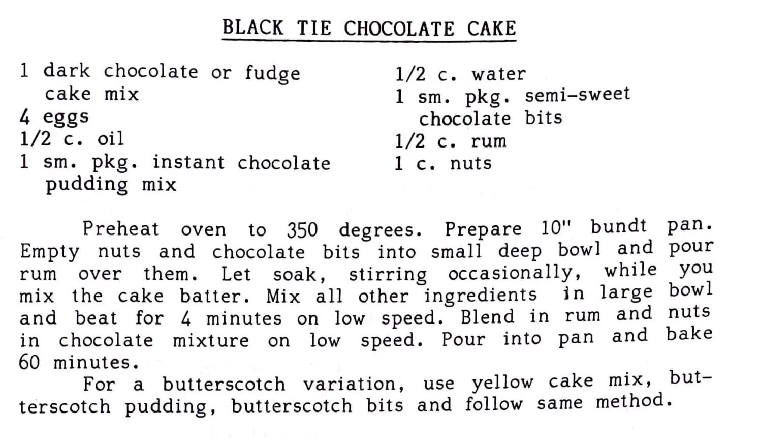 Preheat oven to 350 degrees. Prepare 10” bundt pan. Empty nuts and chocolate bits into small deep bowl and pour rum over them. Let soak, stirring occasionally, while you mix the cake batter. Mix all other ingredients in large bowl and beat for 4 minutes on low speed. Blend in rum and nuts in chocolate mixture on low speed. Pour into pan and bake 60 minutes.