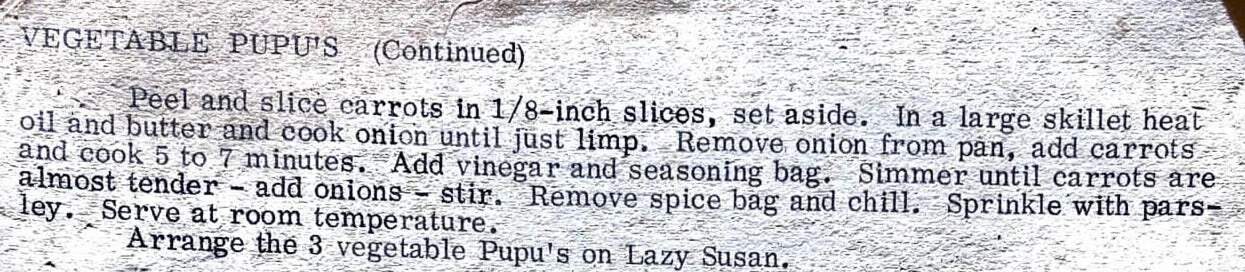 Vegetable Pupus Appetizers Dec 23 Written By Jennifer Hasegawa View fullsize Recipes Home | See All Recipes Kauai Zonta Women's Cookbook (1970s?) Jennifer Hasegawa
