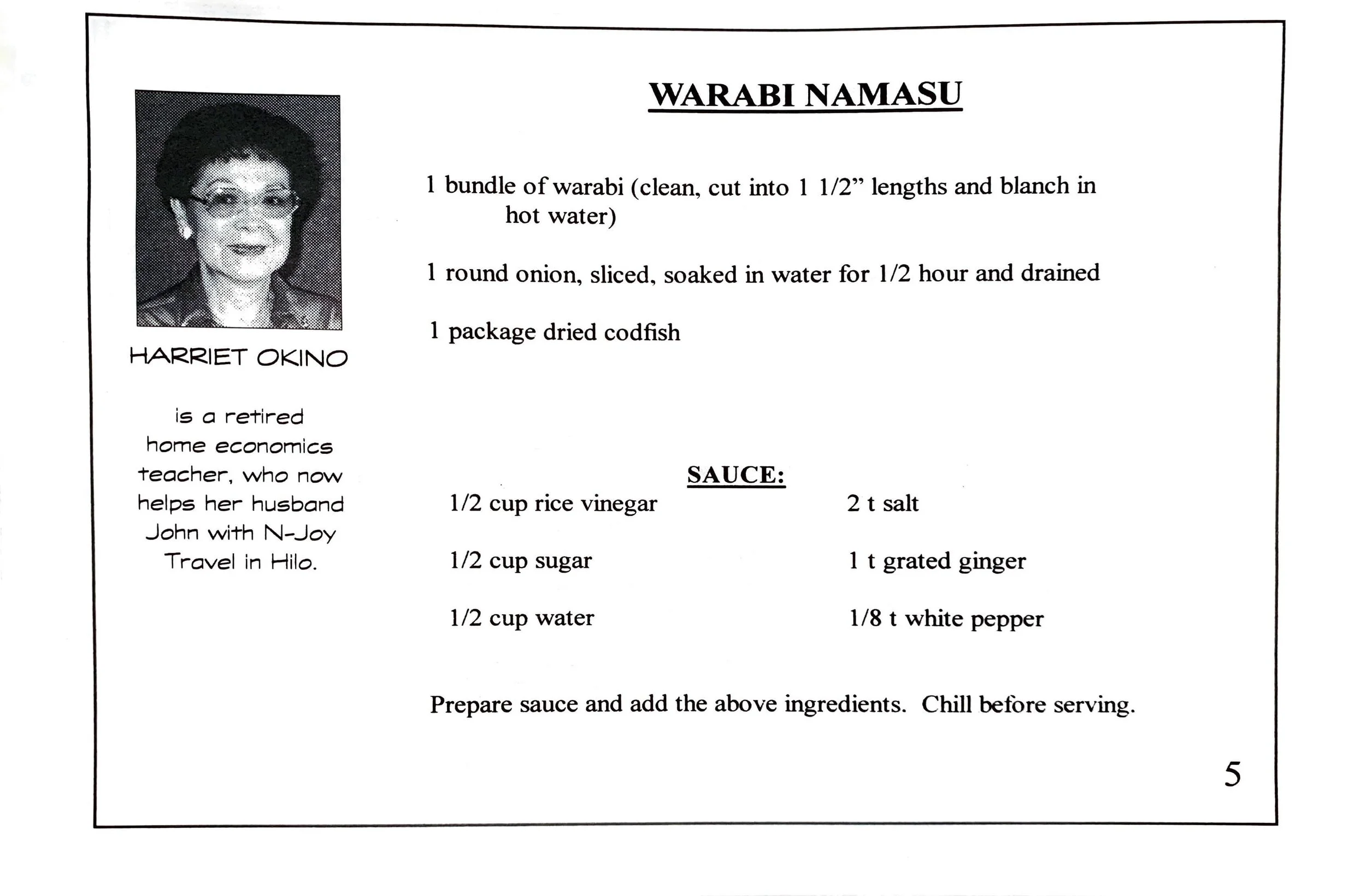 Warabi Namasu #1 Main Dishes Dec 12 Written By Jennifer Hasegawa View fullsize Recipes Home | See All Recipes Harriet OkinoWinter HolidaysLet's Cook Warabi (2000) Jennifer Hasegawa